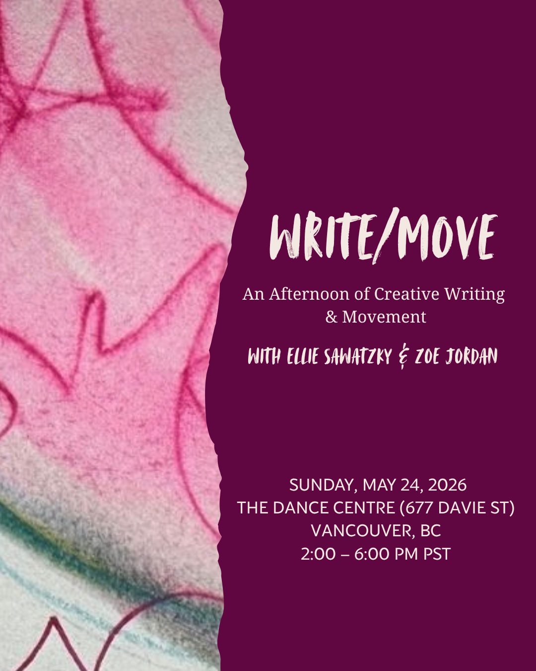 “Write/Move was a joy and a treasure. I left each class feeling creatively nourished and buzzing with possibility. Zoe and Ellie have hit upon a rare alchemy that anyone inspired to express themselves through creative writing or movement should experience.”
