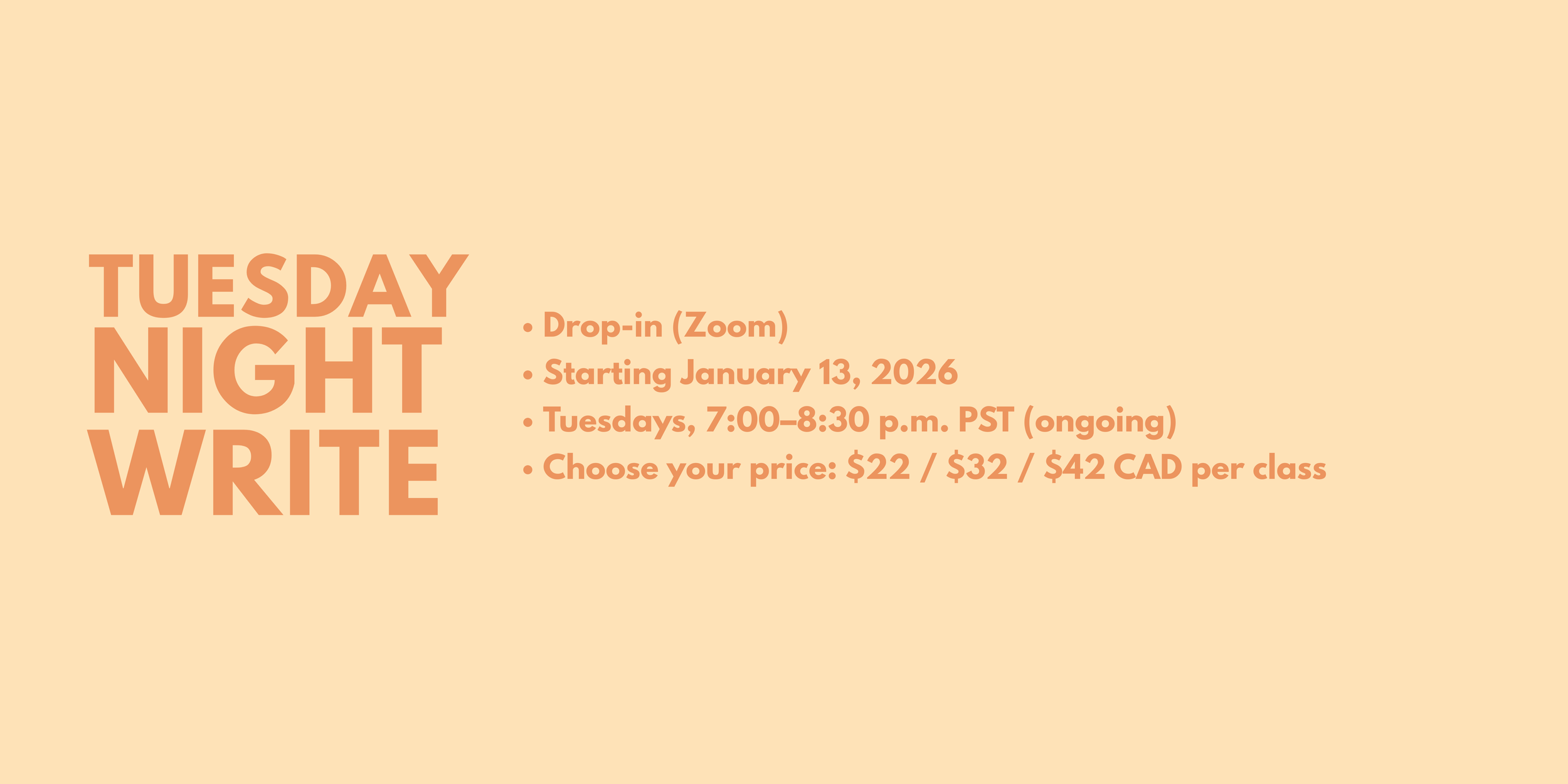In 2026, I’ll be facilitating two creative spaces: Tuesday Night Write (drop-in, Zoom) and Wednesday Night Salon (in person, 8-week series, offered three times: Winter, Spring, Fall).